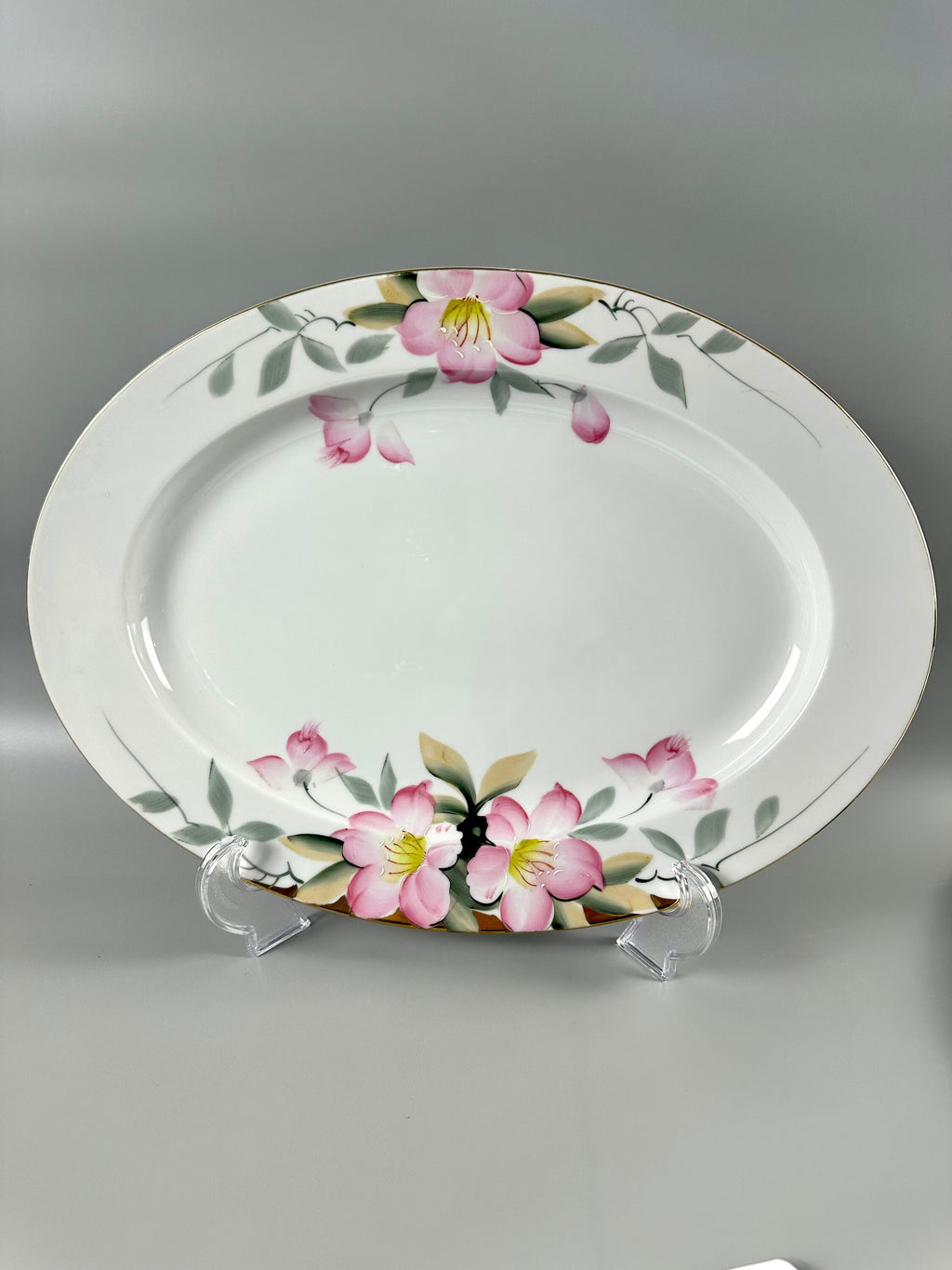 This platter was made in Japan. It was hand painted and is trimmed in gold. It is 16” by 12”. It is different than other large Azalea platters because the flowers spread onto the center of the platter. Most have flowers only on the rim. Condition is excellent vintage with no chips. It has the older red wreath mark. China is carefully packed and shipped with insurance.